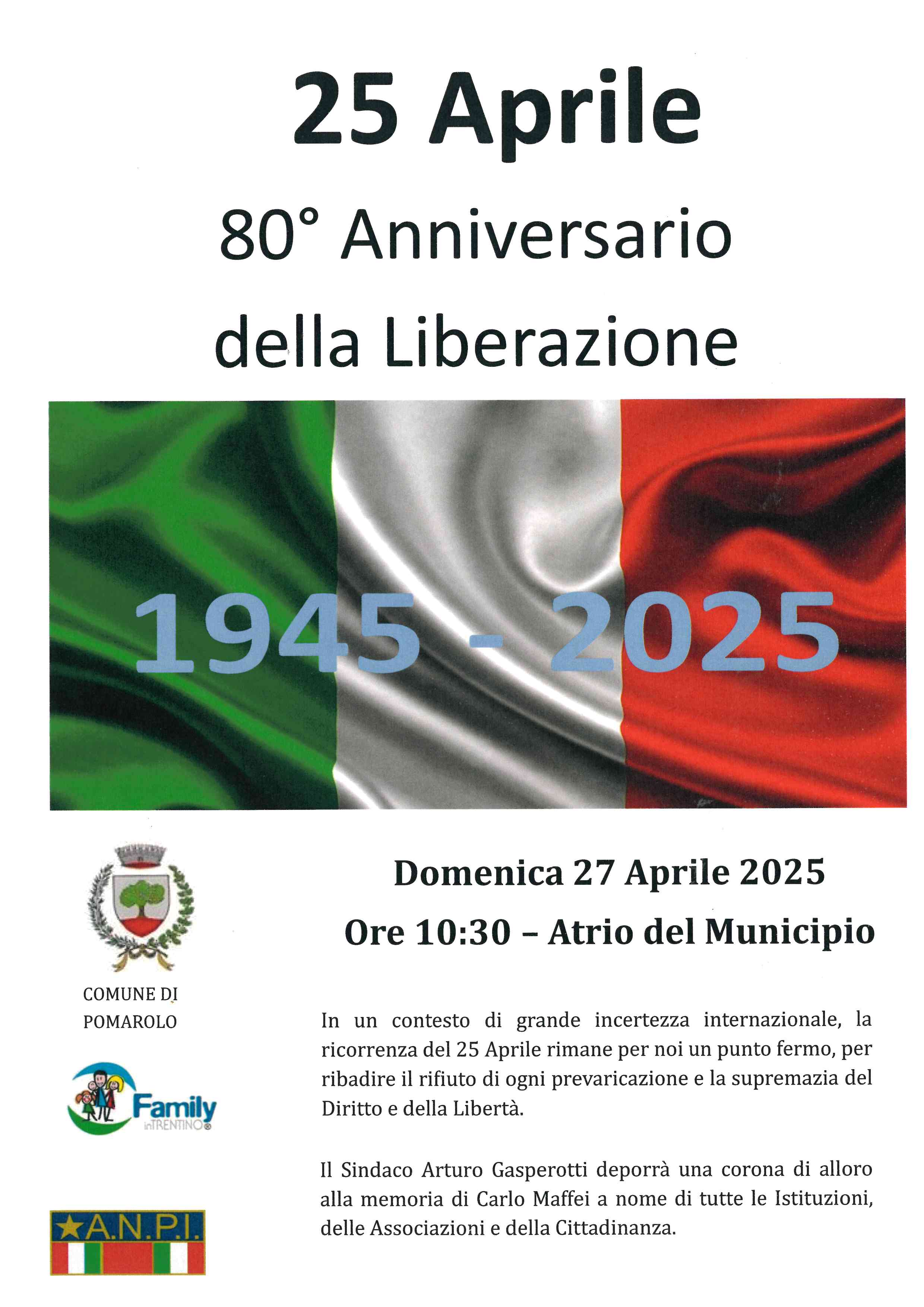 In un contesto di grande incertezza internazionale, la ricorrenza del 25 Aprile rimane, per l'Amministrazione Comunale di Pomarolo, un punto fermo, per ribadire il rifiuto di ogni prevaricazione e la supremazia del Diritto e della Libertà.