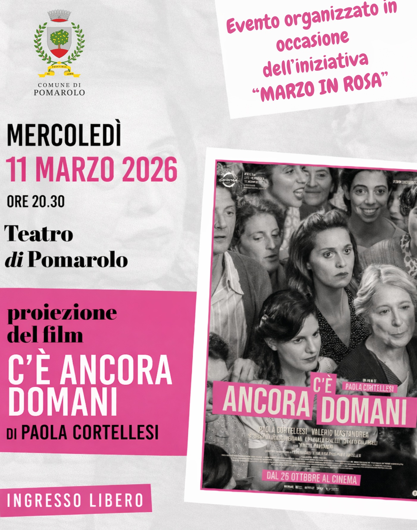 Nell’ambito della rassegna Marzo in Rosa, dedicata alla riflessione sul ruolo delle donne nella società e alla promozione della parità di genere, il Teatro di Pomarolo ospita la proiezione del film C’è ancora domani di Paola Cortellesi.