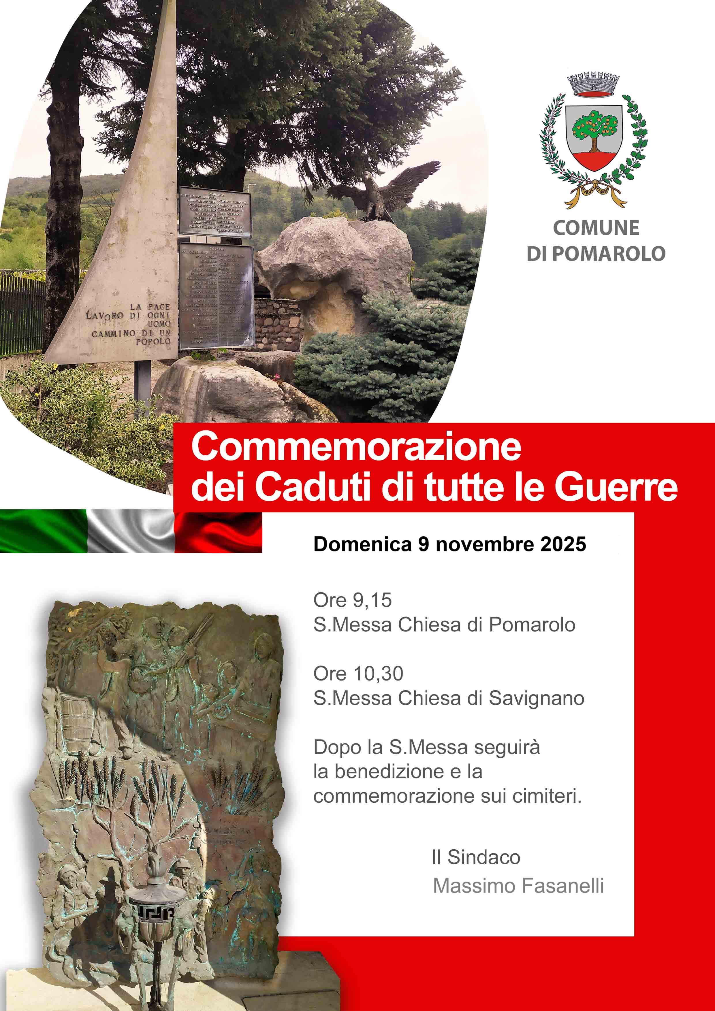 Domenica 9 novembre 2025, ad ore 9,15, presso la Chiesa Parrocchiale di San Cristoforo il parroco presidierà la celebrazione eucaristica. Seguirà la benedizione e la commemorazione dei caduti di tutte le guerre davanti al monumento nel cimitero di Pomarolo.