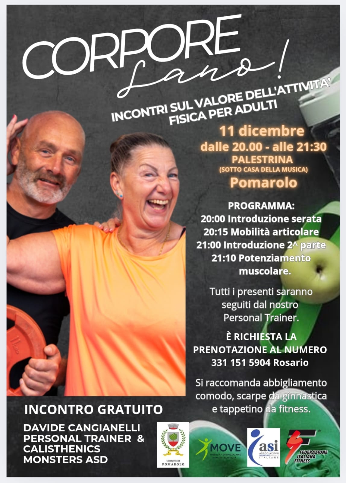 Il Comune di Pomarolo informa la cittadinanza che GIOVEDÌ 11 DICEMBRE alle ore 20.00, presso la PALESTRINA di Pomarolo, si terrà un INCONTRO GRATUITO dedicato alla promozione del benessere fisico nell’ambito dell’iniziativa “Corpore Sano”