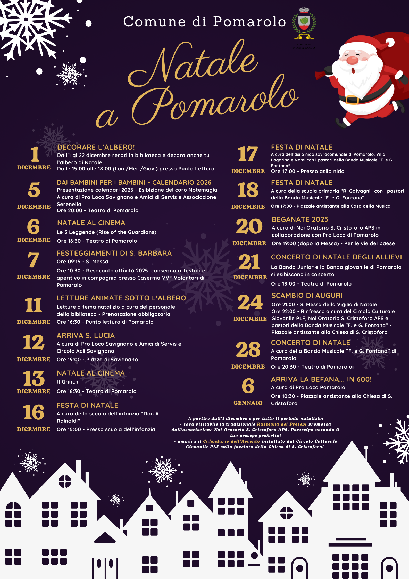 Il Comune di Pomarolo è lieto di condividere la locandina con il calendario delle iniziative in programma sul territorio per il periodo natalizio, realizzate dal Comune e dalle associazioni del nostro territorio.